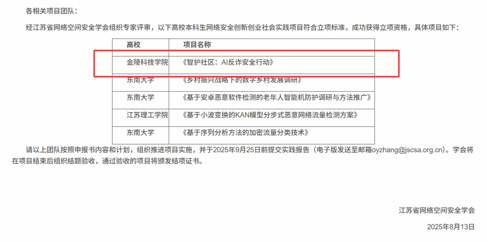 8月13日,江苏省网络空间安全学会公布2024年高校本科生网络安全创新创业社会实践项目立项结果,太阳集团网站8722申报的《智护社区:AI反诈安全行动》成功获批。全省仅5个项目入选,我院项目聚焦人工智能反诈技术,服务社区安全,充分展现学生创新实践能力与社会责任担当。项目团队将按申报计划推进实施,并于9月25日前提交实践报告,迎接省级结题验收。