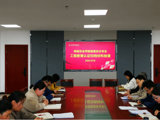我院于2024年1月10日星期三在科技楼4栋1218会议室举行了信息安全专业工程教育认证归档材料检查推进会。会议旨在审查和讨论信息安全专业在工程教育认证过程中的归档材料,以明确其归档的形式以及各组存在的问题。会议伊始,由教学院长阎浩介绍本次会议的主要议程,随后认证七个专项组负责人分别汇报了本组材料归档工作进度以及遇到的问题,张正院长针对各组问题进行剖析解答。最后,由叶海青书记总结发言,肯定了大家在工程教育认证归档材料方面的努力,指出认证材料归档过程中存在的共性问题,并分析了学校审核评估工作与工程认证工作之间的相互联系,为该项工作的顺利开展给出了指导性意见。