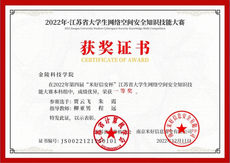 2022年第四届“米好信安杯“江苏省大学生网络空间安全知识技能大赛本科组一等奖