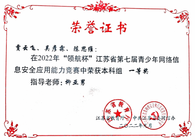2022年“领航杯”第七届江苏当青少年网络信息安全应用能力竞赛一等奖