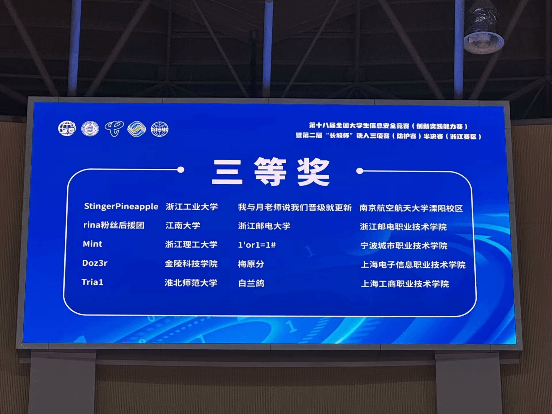 2025年3月16日,在杭州电子科技大学刚刚落幕的第十八届全国大学生信息安全竞赛(创新实践能力赛)暨第二届“长城杯”铁人三项赛(防护赛)半决赛中,太阳集团网站8722Dozer、Doz3r两支学生团队凭借扎实的技术功底与出色的实战能力,分别斩获浙江赛区二等奖、三等奖,展现了学校在网络安全人才培养领域的卓越成果。